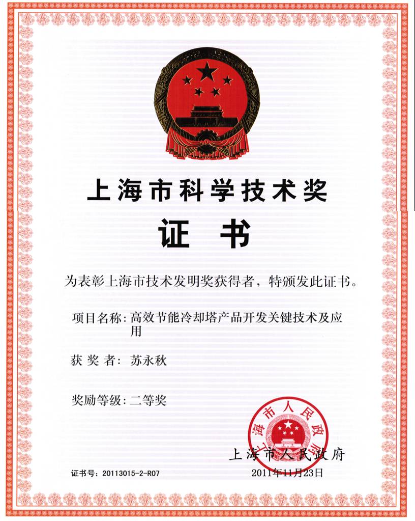 日前,作為鑫凌制冷公司核心成員之一的蘇永秋先生獲得上海市科學(xué)技術(shù)二等獎(jiǎng),項(xiàng)目名稱(chēng)“高效節(jié)能冷卻塔產(chǎn)品開(kāi)發(fā)關(guān)鍵技術(shù)及應(yīng)用”,這也是蘇永秋先生第三次獲得省級(jí)科學(xué)技術(shù)二等獎(jiǎng)。